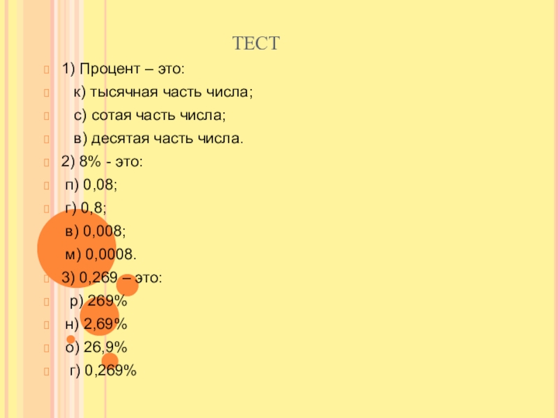 тест1) Процент – это:  к) тысячная часть числа;		  с) сотая часть числа;  в) десятая
