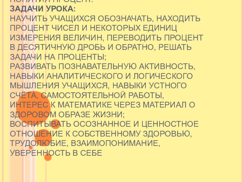 ЧИСЕЛ И НЕКОТОРЫХ ЕДИНИЦ ИЗМЕРЕНИЯ ВЕЛИЧИН, ПЕРЕВОДИТЬ ПРОЦЕНТ В ДЕСЯТИЧНУЮ ДРОБЬ И ОБРАТНО, РЕШАТЬ ЗАДАЧИ НА ПРОЦЕНТЫ; РАЗВИВАТЬ ПОЗНАВАТЕЛЬНУЮ АКТИВНОСТЬ, НАВЫКИ АНАЛИТИЧЕСКОГО И ЛОГИЧЕСКОГО МЫШЛЕНИЯ УЧАЩИХСЯ, НАВЫКИ УСТНОГО СЧЁТА, САМОСТОЯТЕЛЬНОЙ РАБОТЫ, ИНТЕРЕС К МАТЕМАТИКЕ ЧЕРЕЗ МАТЕРИАЛ О ЗДОРОВОМ ОБРАЗЕ ЖИЗНИ; ВОСПИТЫВАТЬ ОСОЗНАННОЕ И ЦЕННОСТНОЕ ОТНОШЕНИЕ К СОБСТВЕННОМУ ЗДОРОВЬЮ, ТРУДОЛЮБИЕ, ВЗАИМОПОНИМАНИЕ, УВЕРЕННОСТЬ В СЕБЕ