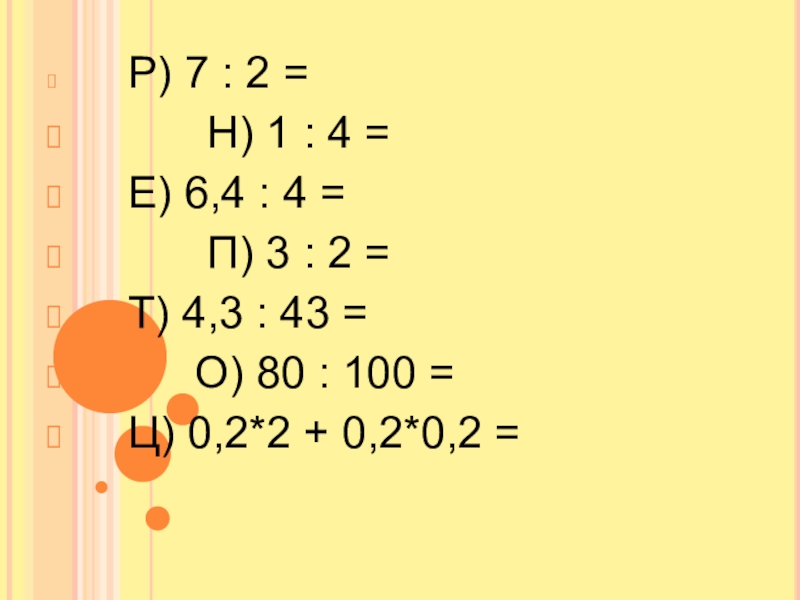 Р) 7 : 2 =			      Н) 1 : 4 =		Е) 6,4 :