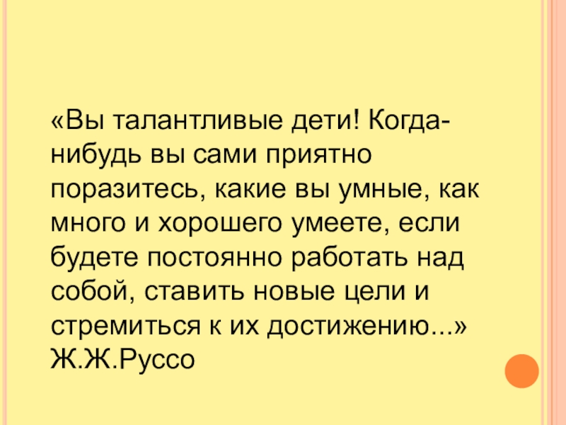 вы умные, как много и хорошего умеете, если будете постоянно работать над собой, ставить новые цели и стремиться к их достижению...» Ж.Ж.Руссо