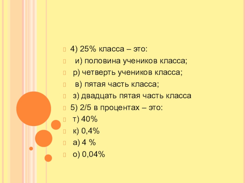 4) 25% класса – это: и) половина учеников класса;    р) четверть учеников класса;