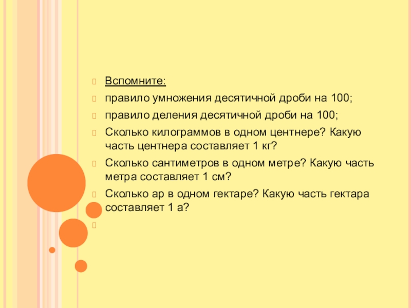 Вспомните:правило умножения десятичной дроби на 100;правило деления десятичной дроби на 100;Сколько килограммов в одном центнере? Какую часть