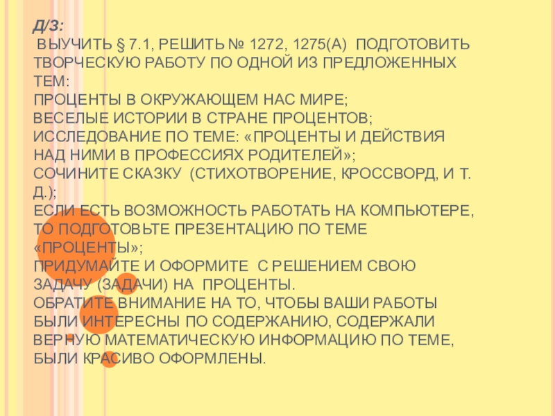 ПО ОДНОЙ ИЗ ПРЕДЛОЖЕННЫХ ТЕМ: ПРОЦЕНТЫ В ОКРУЖАЮЩЕМ НАС МИРЕ; ВЕСЕЛЫЕ ИСТОРИИ В СТРАНЕ ПРОЦЕНТОВ; ИССЛЕДОВАНИЕ ПО ТЕМЕ: «ПРОЦЕНТЫ И ДЕЙСТВИЯ НАД НИМИ В ПРОФЕССИЯХ РОДИТЕЛЕЙ»; СОЧИНИТЕ СКАЗКУ (СТИХОТВОРЕНИЕ, КРОССВОРД, И Т. Д.); ЕСЛИ ЕСТЬ ВОЗМОЖНОСТЬ РАБОТАТЬ НА КОМПЬЮТЕРЕ, ТО ПОДГОТОВЬТЕ ПРЕЗЕНТАЦИЮ ПО ТЕМЕ «ПРОЦЕНТЫ»; ПРИДУМАЙТЕ И ОФОРМИТЕ С РЕШЕНИЕМ СВОЮ ЗАДАЧУ (ЗАДАЧИ) НА ПРОЦЕНТЫ. ОБРАТИТЕ ВНИМАНИЕ НА ТО, ЧТОБЫ ВАШИ РАБОТЫ БЫЛИ ИНТЕРЕСНЫ ПО СОДЕРЖАНИЮ, СОДЕРЖАЛИ ВЕРНУЮ МАТЕМАТИЧЕСКУЮ ИНФОРМАЦИЮ ПО ТЕМЕ, БЫЛИ КРАСИВО ОФОРМЛЕНЫ.