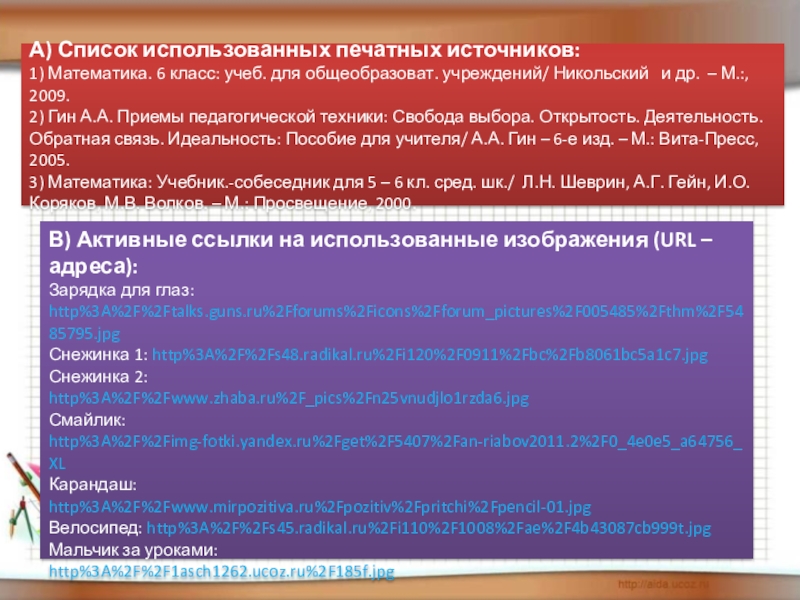 В) Активные ссылки на использованные изображения (URL – адреса):