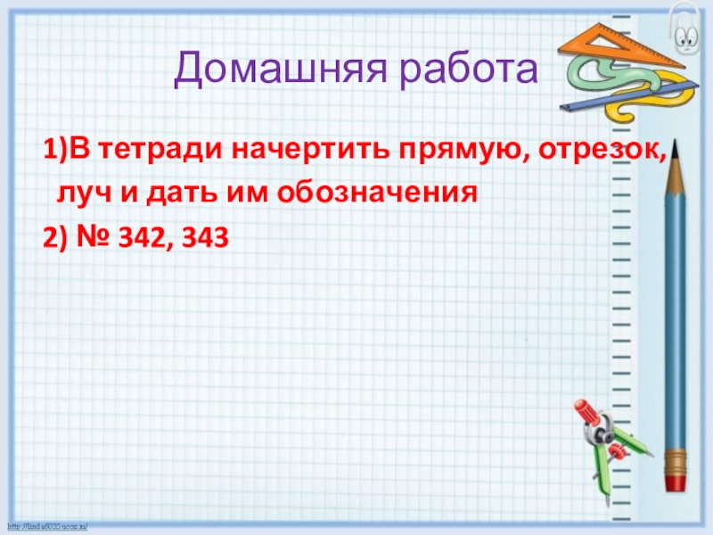 Домашняя работа1)В тетради начертить прямую, отрезок,  луч и дать им обозначения2) № 342, 343