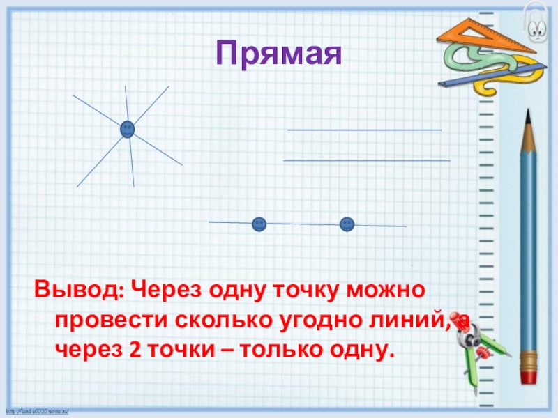 ПрямаяВывод: Через одну точку можно провести сколько угодно линий, а через 2 точки – только одну.