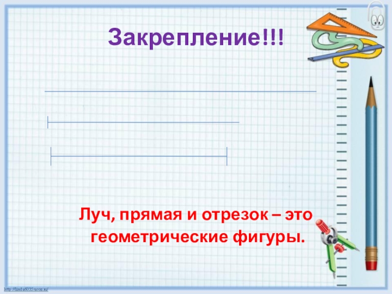 Закрепление!!!Луч, прямая и отрезок – это геометрические фигуры.