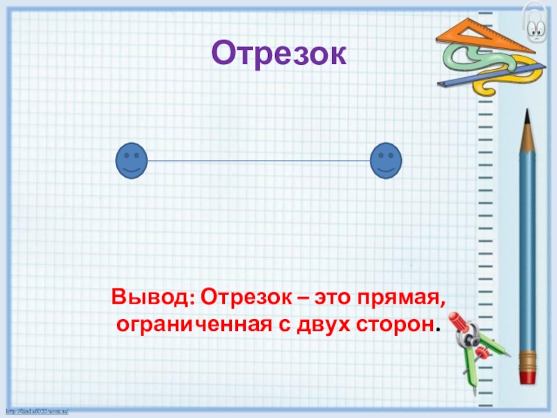 Отрезок    Вывод: Отрезок – это прямая,ограниченная с двух сторон.