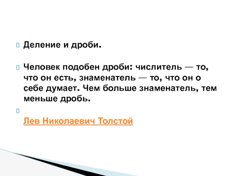Деление и дроби.  Человек подобен дроби: числитель — то, что он есть, знаменатель — то, что
