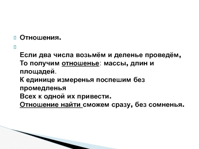 Отношения. Если два числа возьмём и деленье проведём, То получим отношенье: массы, длин и площадей. К единице