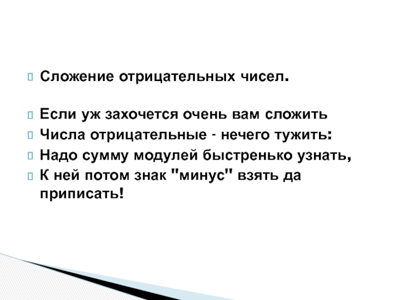 Сложение отрицательных чисел.  Если уж захочется очень вам сложить Числа отрицательные - нечего тужить: Надо сумму