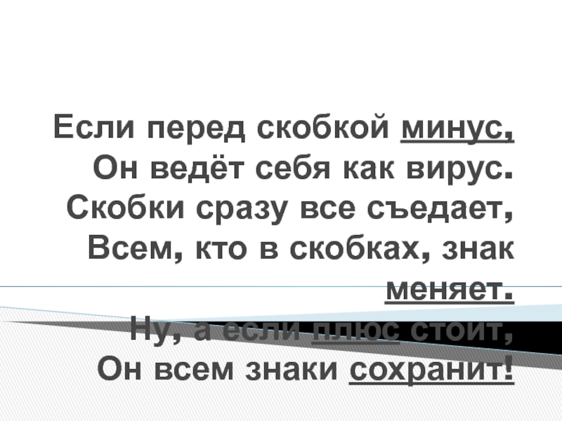 Слайд 2Если перед скобкой минус, Он ведёт себя как вирус. Скобки сразу все съедает, Всем,