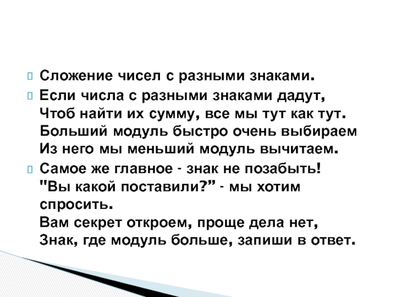 Сложение чисел с разными знаками.Если числа с разными знаками дадут,  Чтоб найти их сумму, все мы