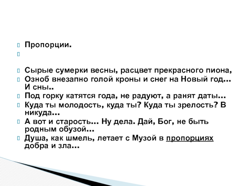 Пропорции. Сырые сумерки весны, расцвет прекрасного пиона,Озноб внезапно голой кроны и снег на Новый год... И сны..Под
