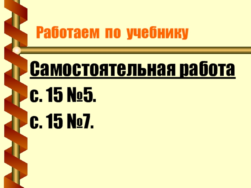 Работаем по учебникуСамостоятельная работас. 15 №5.с. 15 №7.