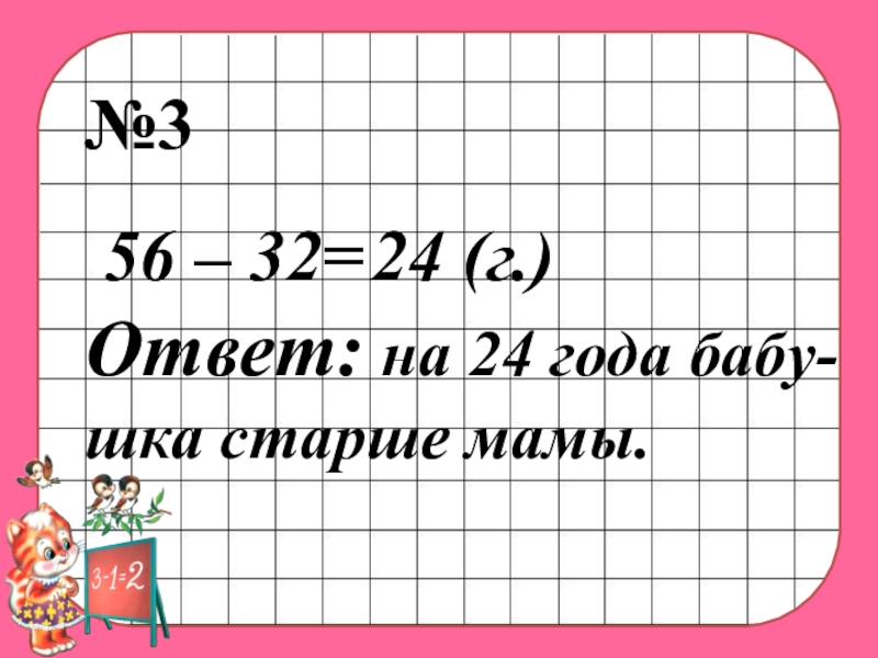 №3 56 – 32= 24 (г.)Ответ: на 24 года бабу-шка старше мамы.