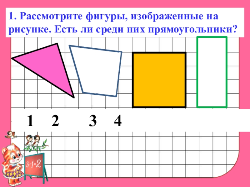 1. Рассмотрите фигуры, изображенные на рисунке. Есть ли среди них прямоугольники?	1		2			3		4
