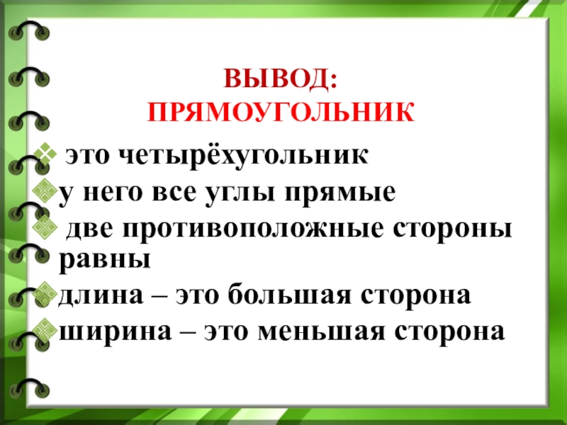 Вывод: Прямоугольник это четырёхугольнику него все углы прямые две противоположные стороны равныдлина – это большая сторона ширина