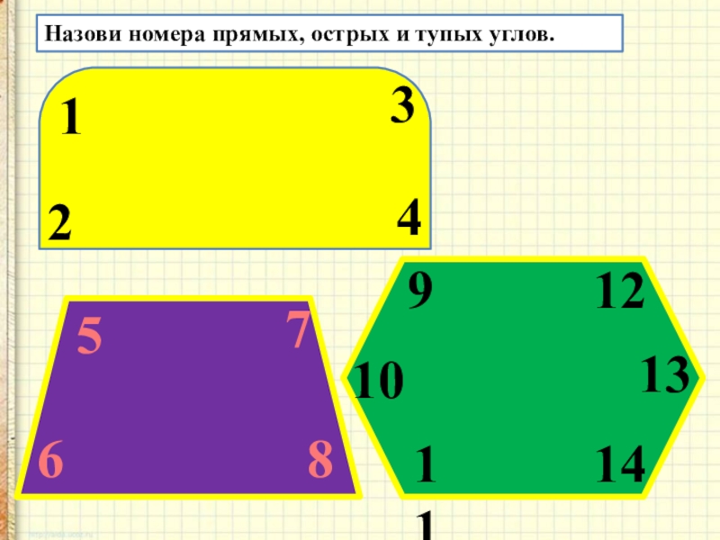 Назови номера прямых, острых и тупых углов.1234567891011121314