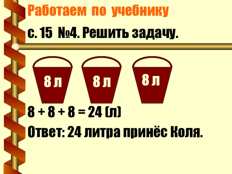 Работаем по учебникус. 15 №4. Решить задачу.8 + 8 + 8 = 24 (л)Ответ: 24 литра принёс