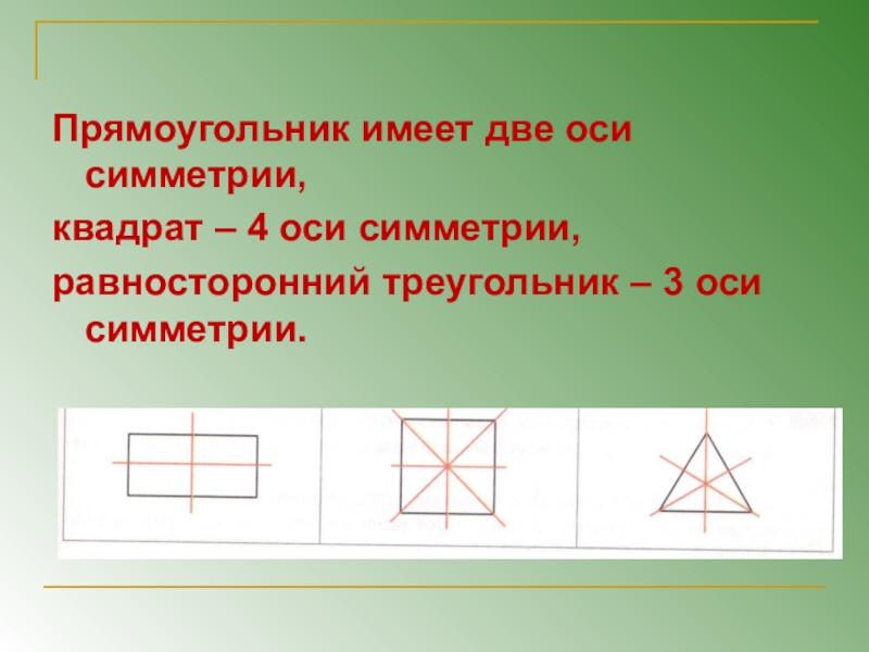 Прямоугольник имеет две оси симметрии,квадрат – 4 оси симметрии,равносторонний треугольник – 3 оси симметрии.