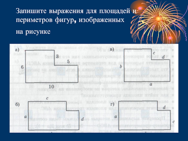 Слайд 5Запишите выражения для площадей и периметров фигур, изображенных на рисунке