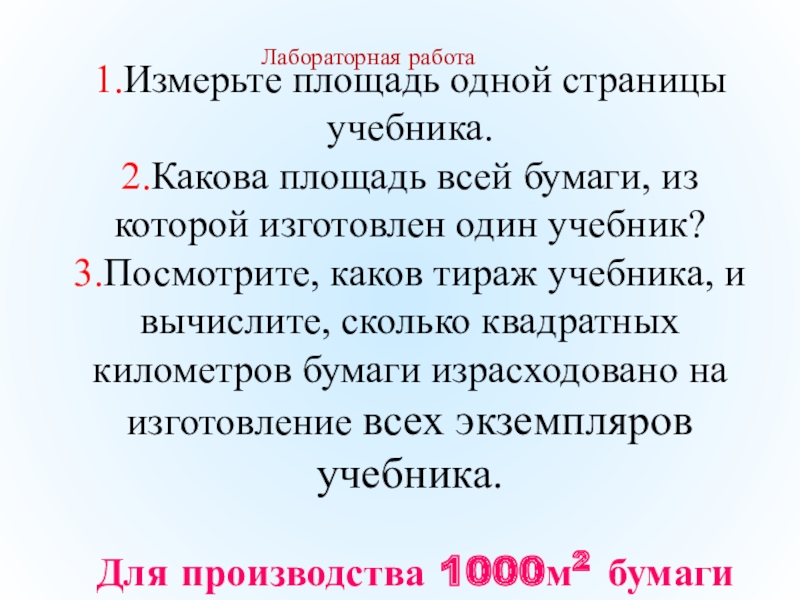 3.Посмотрите, каков тираж учебника, и вычислите, сколько квадратных километров бумаги израсходовано на изготовление всех экземпляров учебника.