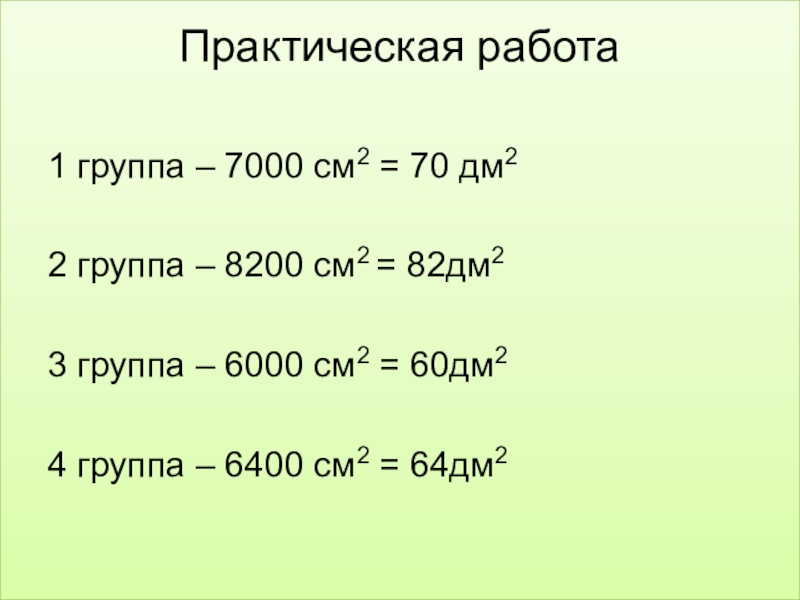 Практическая работа 1 группа – 7000 см2 = 70 дм2 2 группа – 8200 см2 = 82дм2