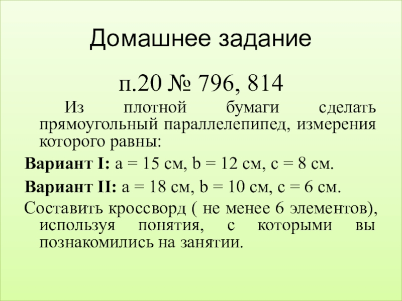 Домашнее заданиеп.20 № 796, 814		Из плотной бумаги сделать прямоугольный параллелепипед, измерения которого равны:Вариант I: а = 15
