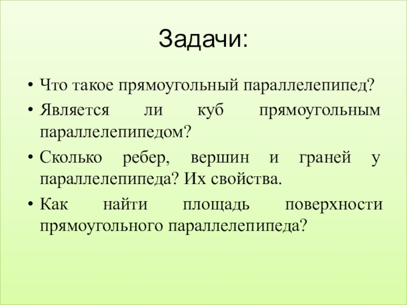 Задачи:Что такое прямоугольный параллелепипед?Является ли куб прямоугольным параллелепипедом?Сколько ребер, вершин и граней у параллелепипеда? Их свойства.Как найти