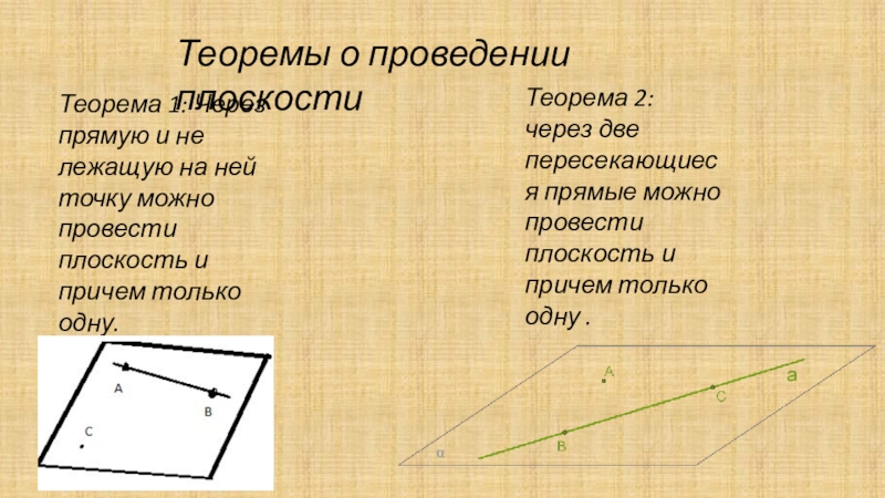 Теорема 2: через две пересекающиеся прямые можно провести плоскость и причем только одну .