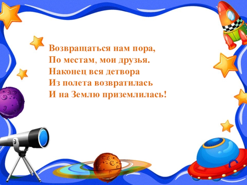 !Возвращаться нам пора,По местам, мои друзья.Наконец вся детвораИз полета возвратиласьИ на Землю приземлилась!