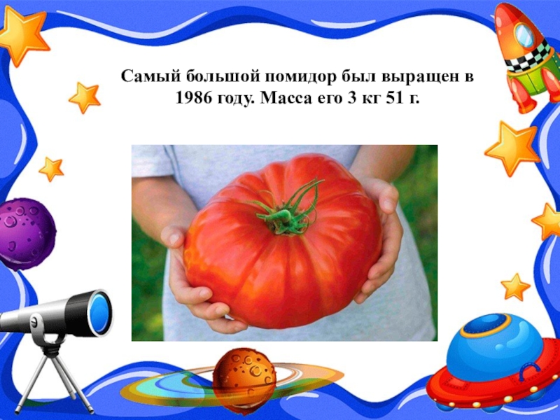 Слайд 18Самый большой помидор был выращен в 1986 году. Масса его 3