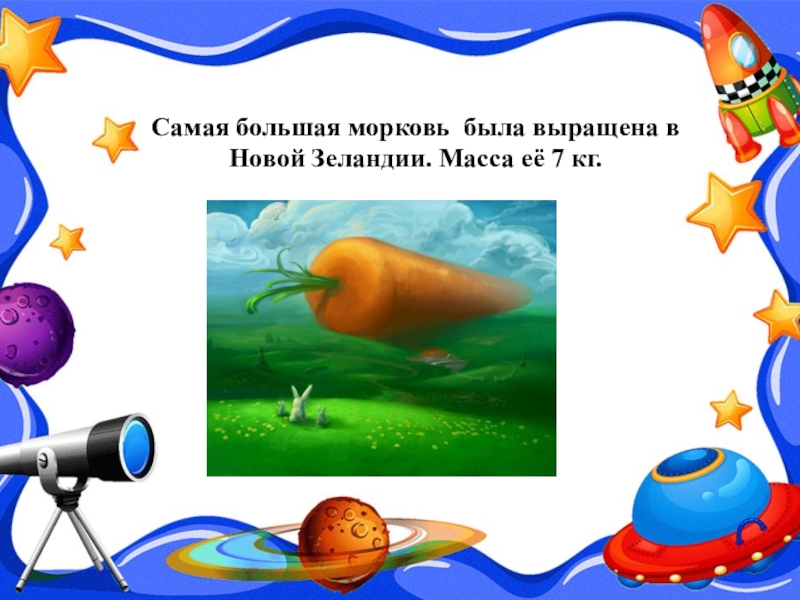 Слайд 14Самая большая морковь была выращена в Новой Зеландии. Масса её 7