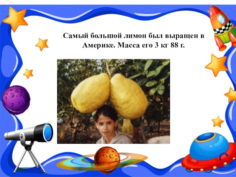 Слайд 15Самый большой лимон был выращен в Америке. Масса его 3 кг