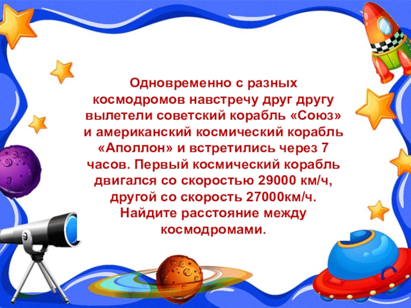 и американский космический корабль «Аполлон» и встретились через 7 часов. Первый космический корабль двигался со скоростью 29000 км/ч, другой со скорость 27000км/ч. Найдите расстояние между космодромами.
