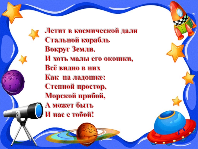 Летит в космической дали Стальной корабль Вокруг Земли.И хоть малы его окошки,Всё видно в них Как на