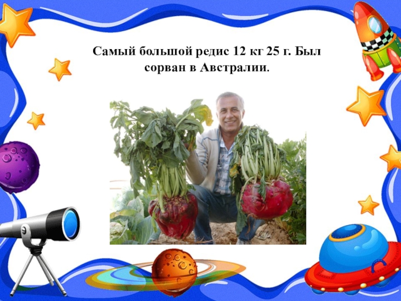 Слайд 17Самый большой редис 12 кг 25 г. Был сорван в Австралии.