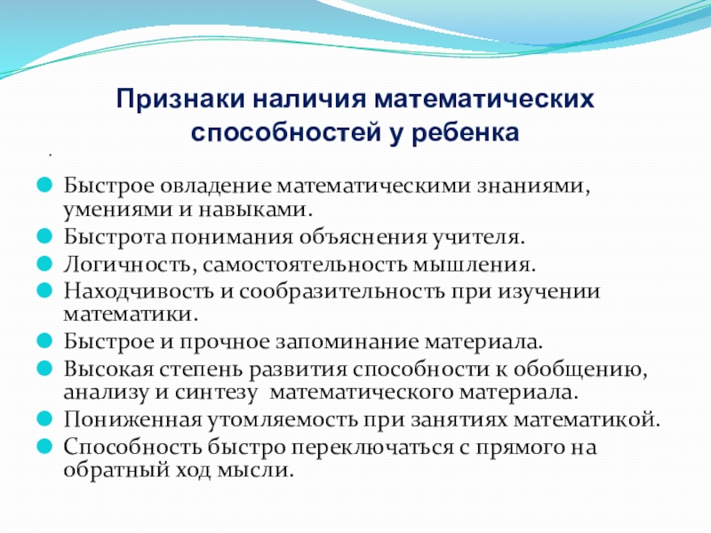 Высокая степень развития способности к обобщению, анализу и синтезу математического материала.