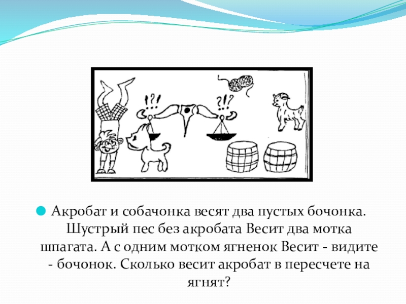 Весит два мотка шпагата. А с одним мотком ягненок Весит - видите - бочонок. Сколько весит акробат в пересчете на ягнят?