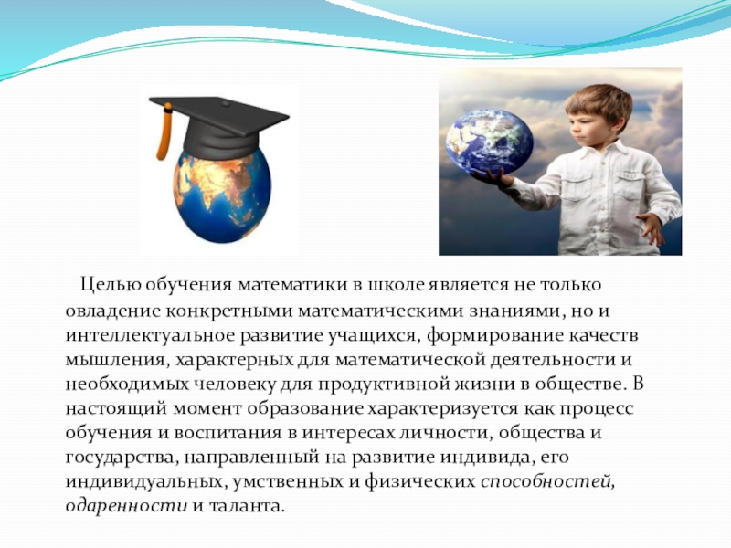 конкретными математическими знаниями, но и интеллектуальное развитие учащихся, формирование качеств мышления, характерных для математической деятельности и необходимых человеку для продуктивной жизни в обществе. В настоящий момент образование характеризуется как процесс обучения и воспитания в интересах личности, общества и государства, направленный на развитие индивида, его индивидуальных, умственных и физических способностей, одаренности и таланта.