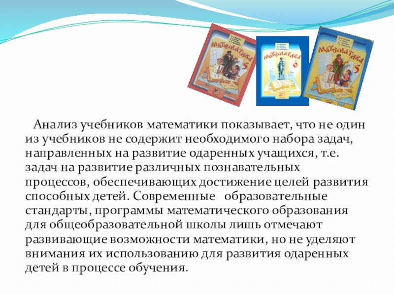 не содержит необходимого набора задач, направленных на развитие одаренных учащихся, т.е. задач на развитие различных познавательных процессов, обеспечивающих достижение целей развития способных детей. Современные образовательные стандарты, программы математического образования для общеобразовательной школы лишь отмечают развивающие возможности математики, но не уделяют внимания их использованию для развития одаренных детей в процессе обучения.