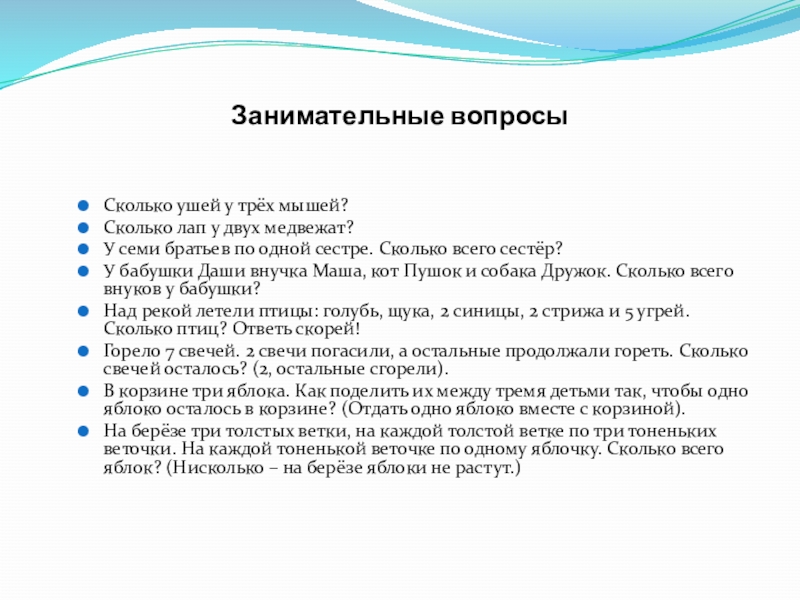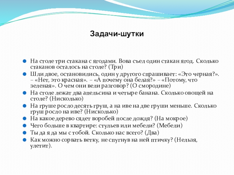 На берёзе три толстых ветки, на каждой толстой ветке по три тоненьких веточки. На каждой тоненькой веточке по одному яблочку. Сколько всего яблок? (Нисколько – на берёзе яблоки не растут.)