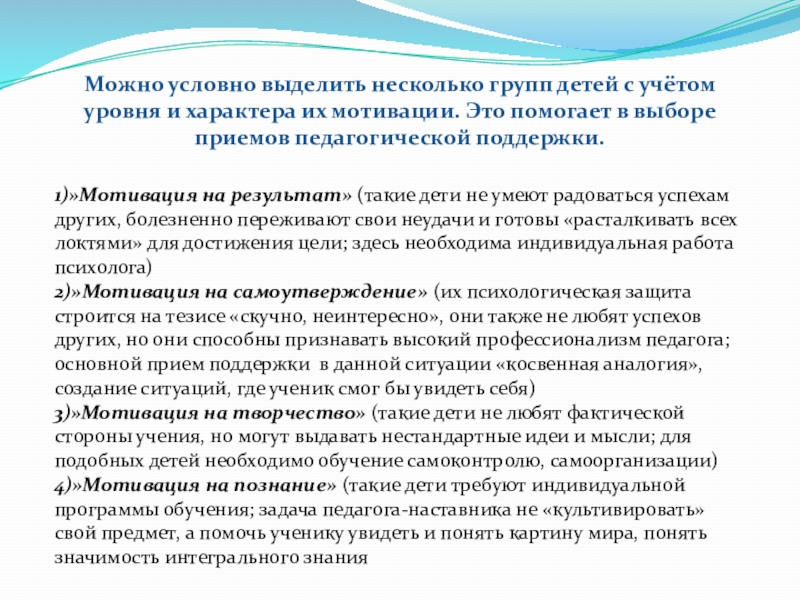 их мотивации. Это помогает в выборе приемов педагогической поддержки.