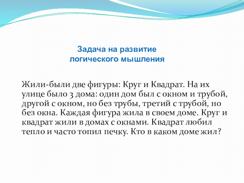 улице было 3 дома: один дом был с окном и трубой, другой с окном, но без трубы, третий с трубой, но без окна. Каждая фигура жила в своем доме. Круг и квадрат жили в домах с окнами. Квадрат любил тепло и часто топил печку. Кто в каком доме жил?
