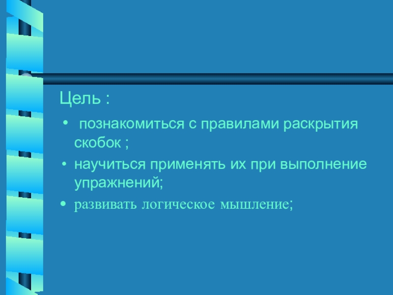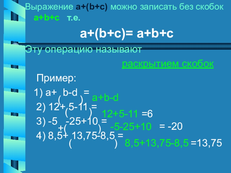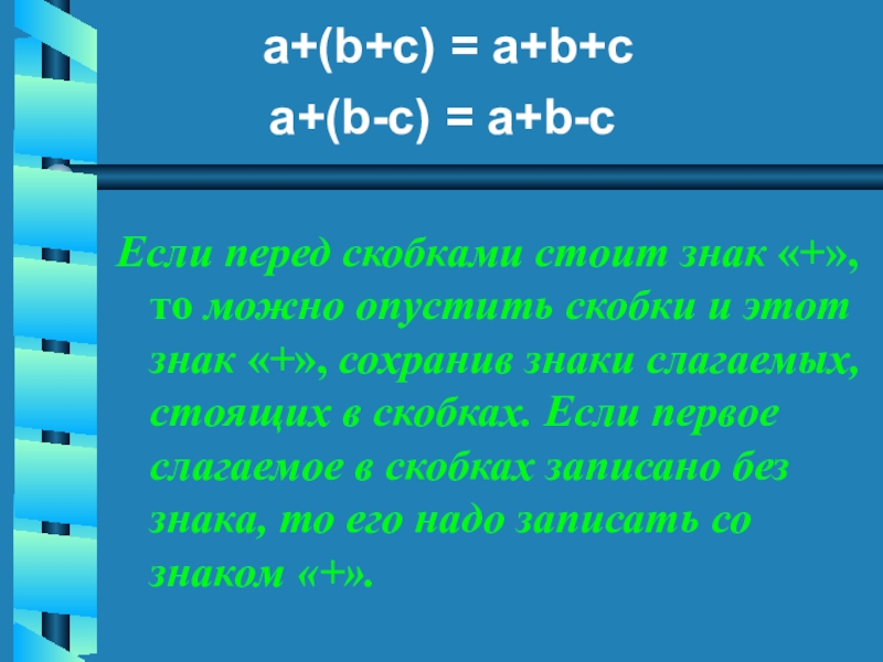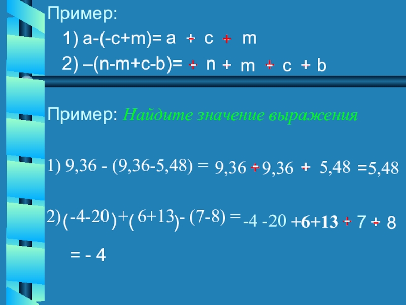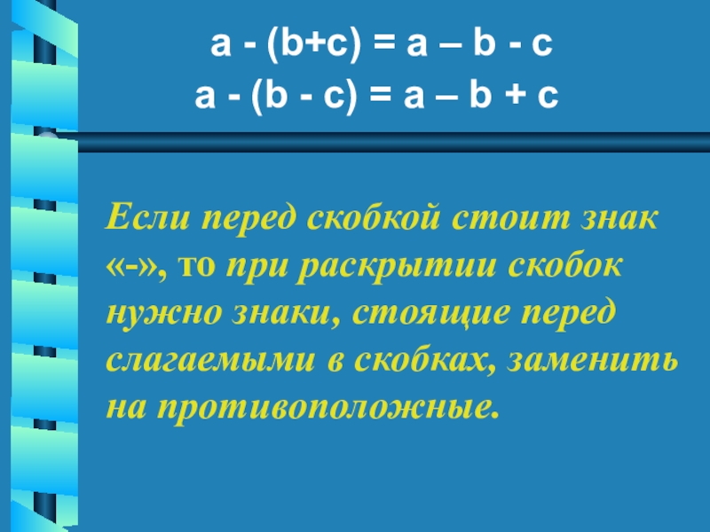Если перед скобкой стоит знак «-», то при раскрытии скобок нужно знаки, стоящие перед слагаемыми в скобках, заменить на противоположные.