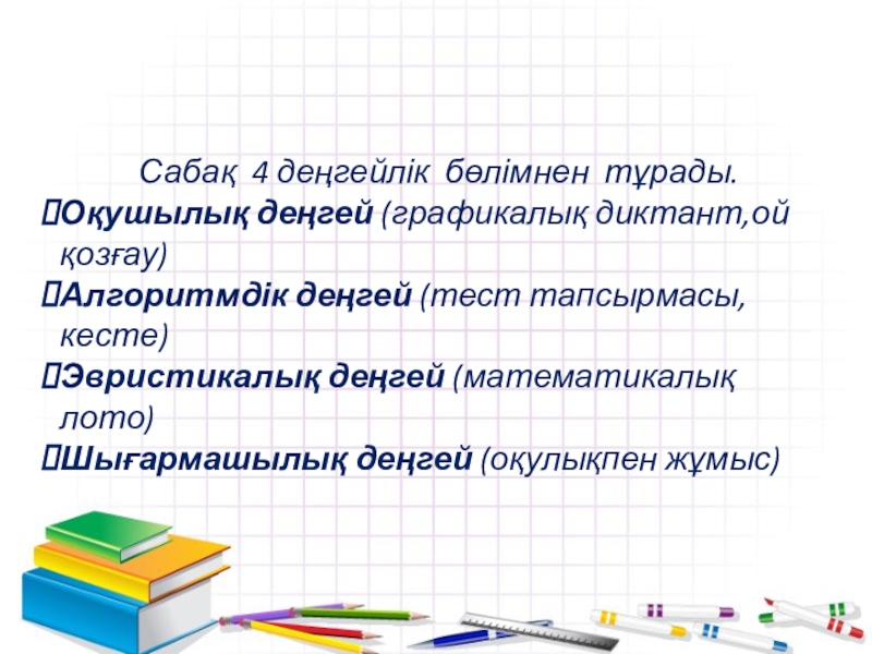 Сабақ  4 деңгейлік  бөлімнен  тұрады.Оқушылық деңгей (графикалық диктант,ой қозғау)Алгоритмдік деңгей (тест тапсырмасы,кесте)Эвристикалық деңгей (математикалық лото)Шығармашылық деңгей