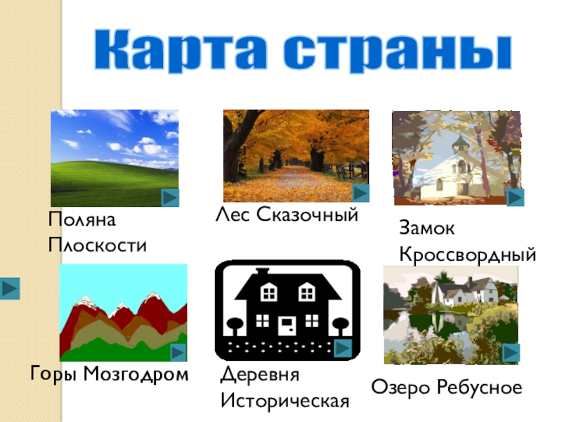 Карта страныЛес СказочныйЗамок КроссвордныйОзеро РебусноеГоры МозгодромПоляна ПлоскостиДеревня Историческая