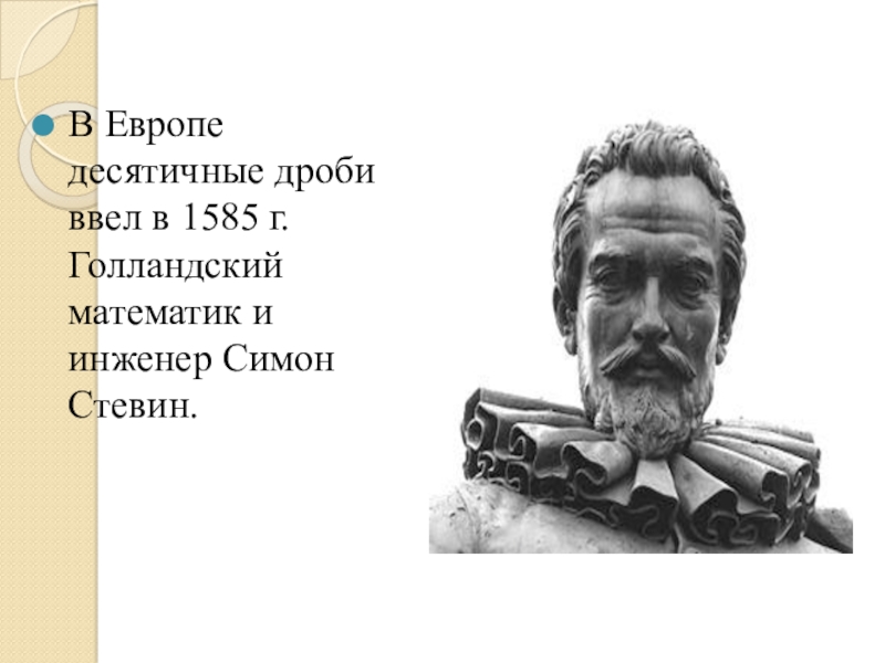 В Европе десятичные дроби ввел в 1585 г. Голландский математик и инженер Симон Стевин.