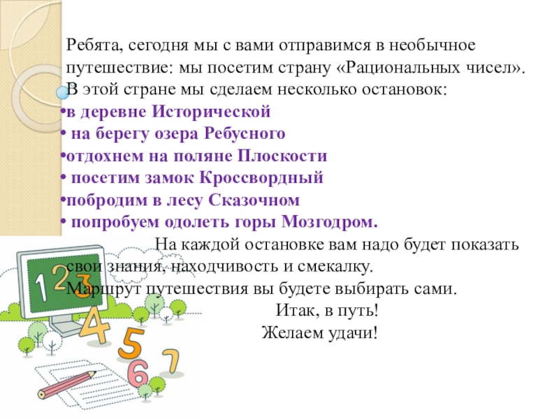 Ребята, сегодня мы с вами отправимся в необычное путешествие: мы посетим страну «Рациональных чисел».В этой стране мы